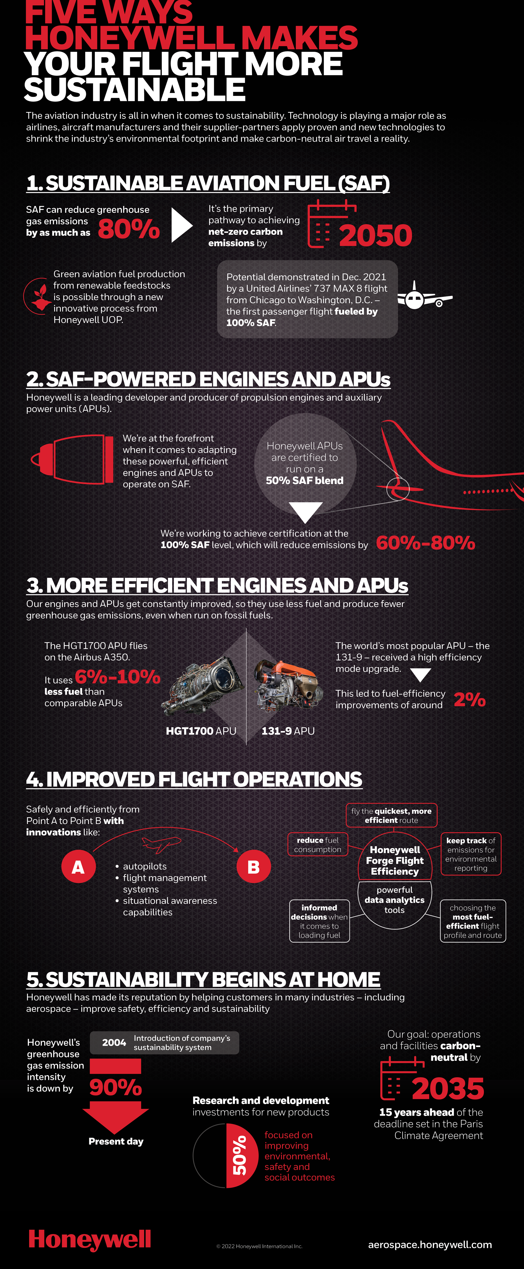 5. Sustainability Begins at Home. Honeywell has made its reputation by helping customers in many industries – including aerospace – improve safety, efficiency and sustainability. We also are working to make our own operations and facilities carbon-neutral by 2035 – 15 years ahead of the deadline set in the Paris Agreement. Honeywell greenhouse gas emission intensity is down 90% since we introduced our sustainability system in 2004 and about half of our research and development investments for new products are focused on things that will improve environmental, safety and social outcomes for our customers and the planet.
