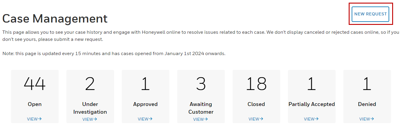 On the Case Management page, you'll find a New Request button located at the top right corner. By clicking this button, you'll be redirected to our Contact Us page, where you can choose the specific type of support case for which you wish to create a new request.